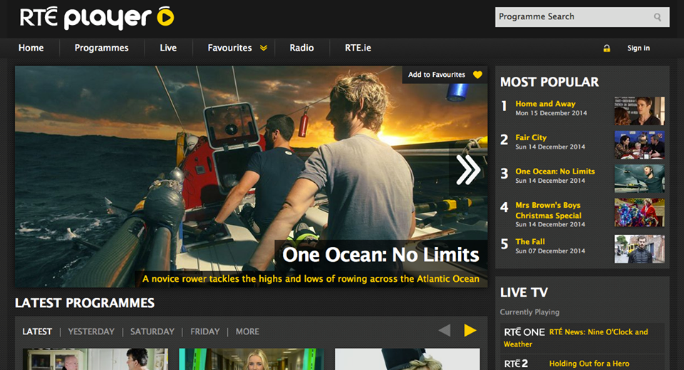 Following acquisition upon completion, One Ocean: No Limits was broadcast on RTÉ2 on Sunday December 14th 2014 at 8pm and was still the 3rd most popular on the RTÉ Player two days after its broadcast - see image below & click for larger image. It was also repeated on RTÉ2 on Sunday August 16th 2015 at 8pm.